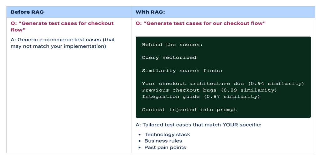 - Document Ingestion: Your documents (test cases, bug reports, architecture docs) are processed and split into manageable chunks